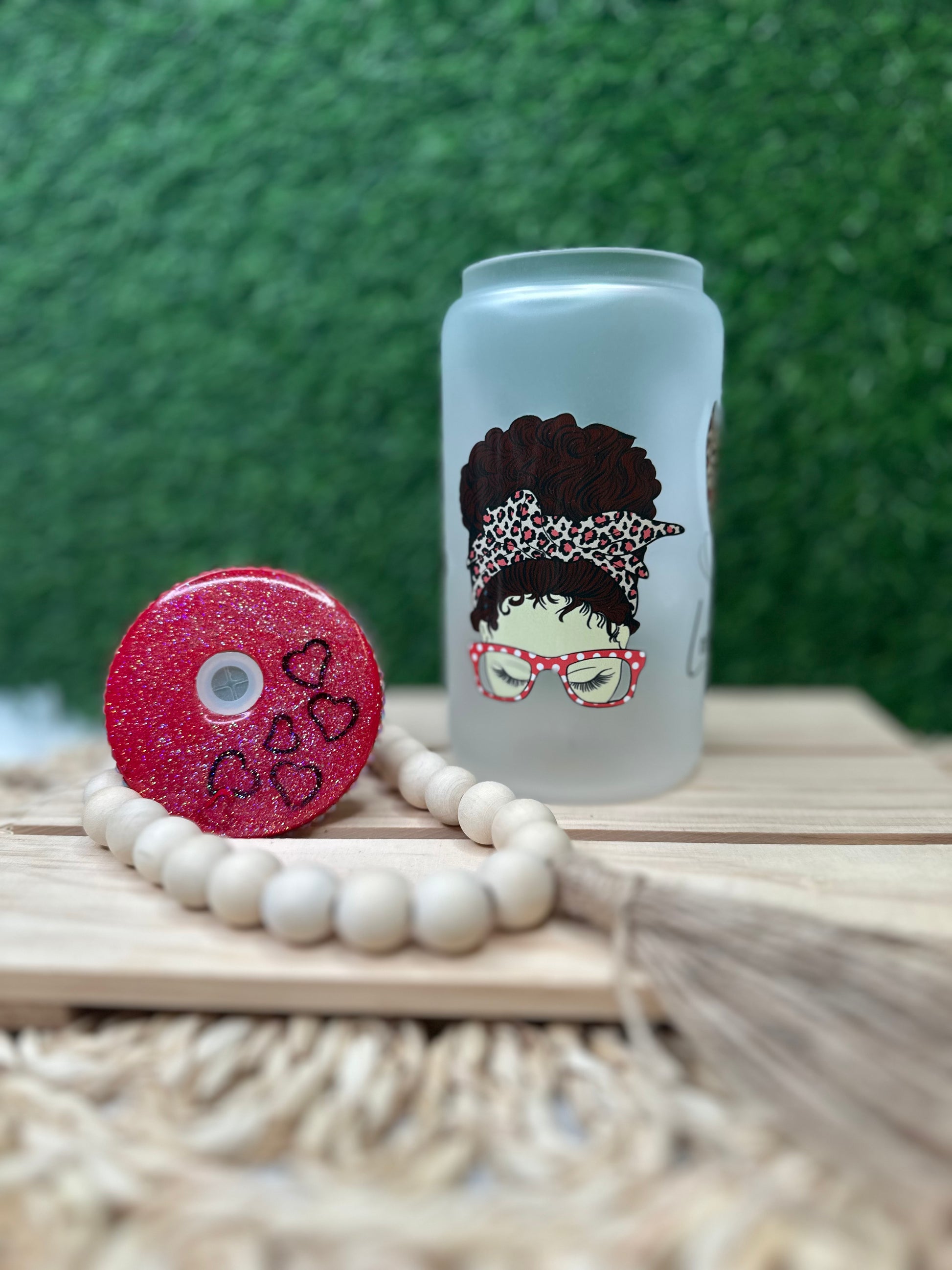Glass can 16 oz with decorated lid.